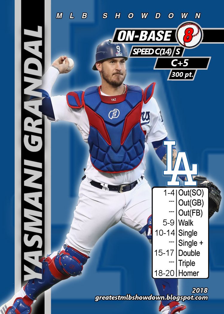 Lineup: The Dodgers lineup is STACKED, and its incredibly deep. There were so many dudes that needed cards on this squad that the Dodgers ended up with 13 players in the 2018 set. Shockingly, 11 of those players are at least 250 points -- an incredible display of depth! In the starting lineup, there's a bunch of power from Bellinger, Machado, and Muncy, as well as extremely productive and steady hitting from Turner, at the top of the lineup. Grandal's really solid year has been overshadowed by his postseason struggles, but he put up a very decent card, especially for a catcher! The 6 thru 8 spots are filled with potent OB 7 cards, a luxury shared by no other teams in this set. And off the bench comes a very good David Freese, another weapon of an OB 7 in Matt Kemp, and Joc Pederson (aka the guy to insert into a lineup against a Control 2 or lower constantly because WOW that chart). If Dozier had reached his 2017 numbers, this team would've been an unfair cheat code. As it stands, it's still the best lineup in the 2018 set.