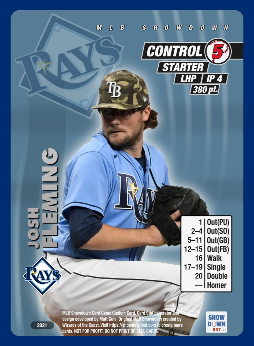 Bullpen: Ah yes, here we go -- the real guys that are discussed when people say pitching is the strength of this team! The bullpen is, as usual in TB, absolutely loaded with Tier 2 and better arms... and they traded away their (at the time) Tier 1 closer Diego Castillo to Seattle!! McHugh and Rasmussen are fascinating as 2 IP pitchers. I recommend having a further understanding of your league's reliever usage rules before spending the 400+ points on them, but if you can go crazy with them, there's a very viable strategy there. Meanwhile, everyone else is definitely draftable, even Fairbanks with his no doubles card for only 160 pts (classic #4 arm in the bullpen to save pts on other positions)